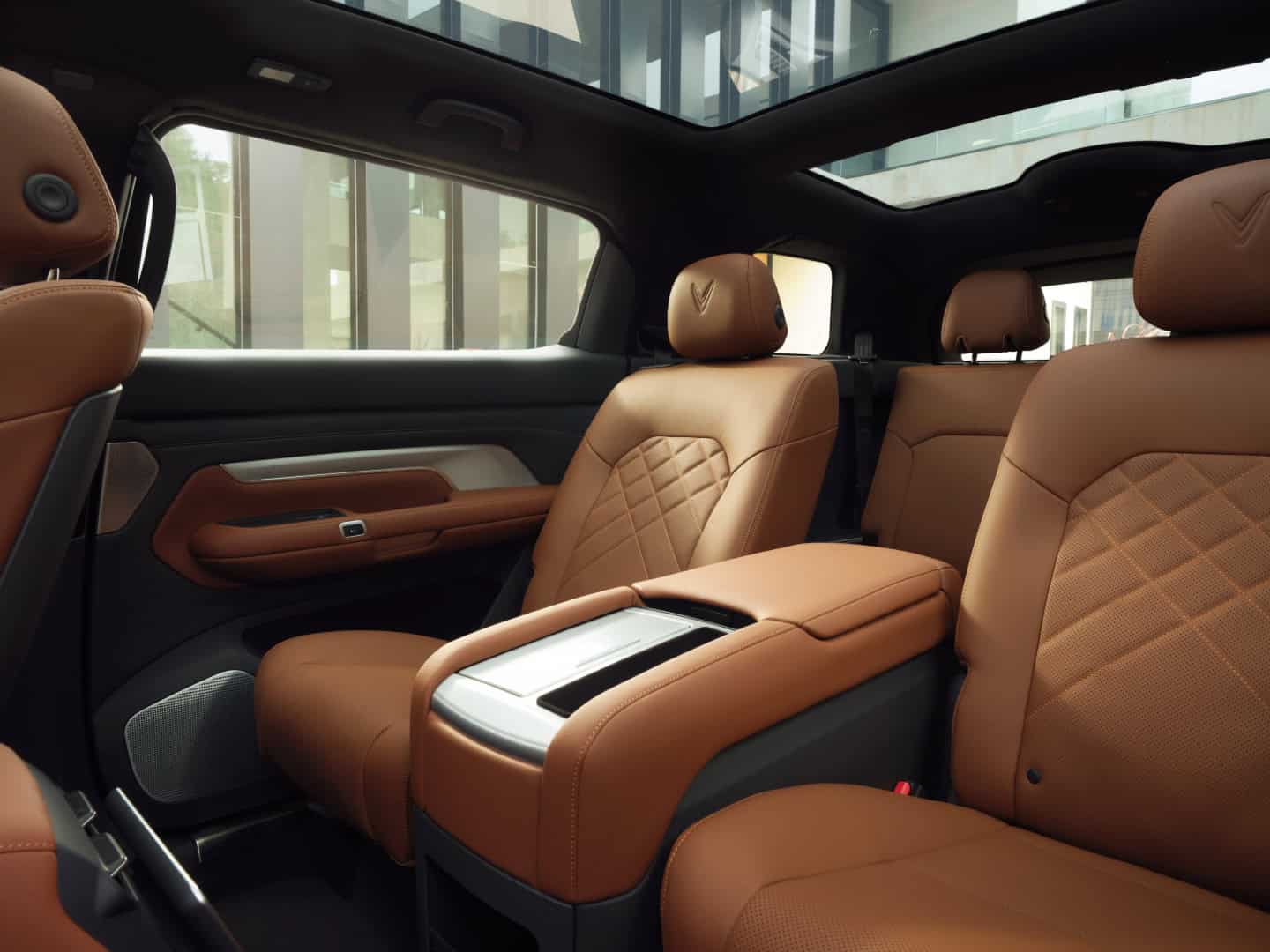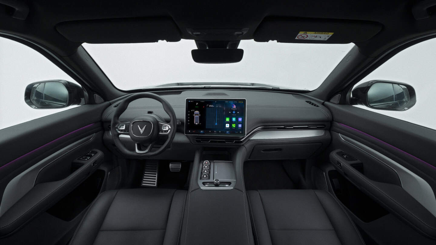 VF9 mang phong cách tối giản nhưng sang trọng với vật liệu da nhân tạo cao cấp. Phiên bản Eco có hai tùy chọn màu nội thất (nâu Saddle Brown và đen Granite Black), trong khi bản Plus bổ sung thêm màu xanh Navy Blue và be Cotton Beige.